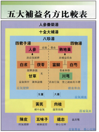 现代社会对补益中药有较高的期望,使用者日渐增多。这里我们对常用的补益名方做一剖析。上图中所示核心部分为补气的基本方「四君子汤」与补血的基本方「四物汤」。二者的组合即所谓「八珍汤」。在此基础上加上肉桂、黄芪,便构成了家喻户晓的「十全大补汤」。君、臣、佐、使,共同构成了一个中医药的交响乐,美妙的和谐之曲。