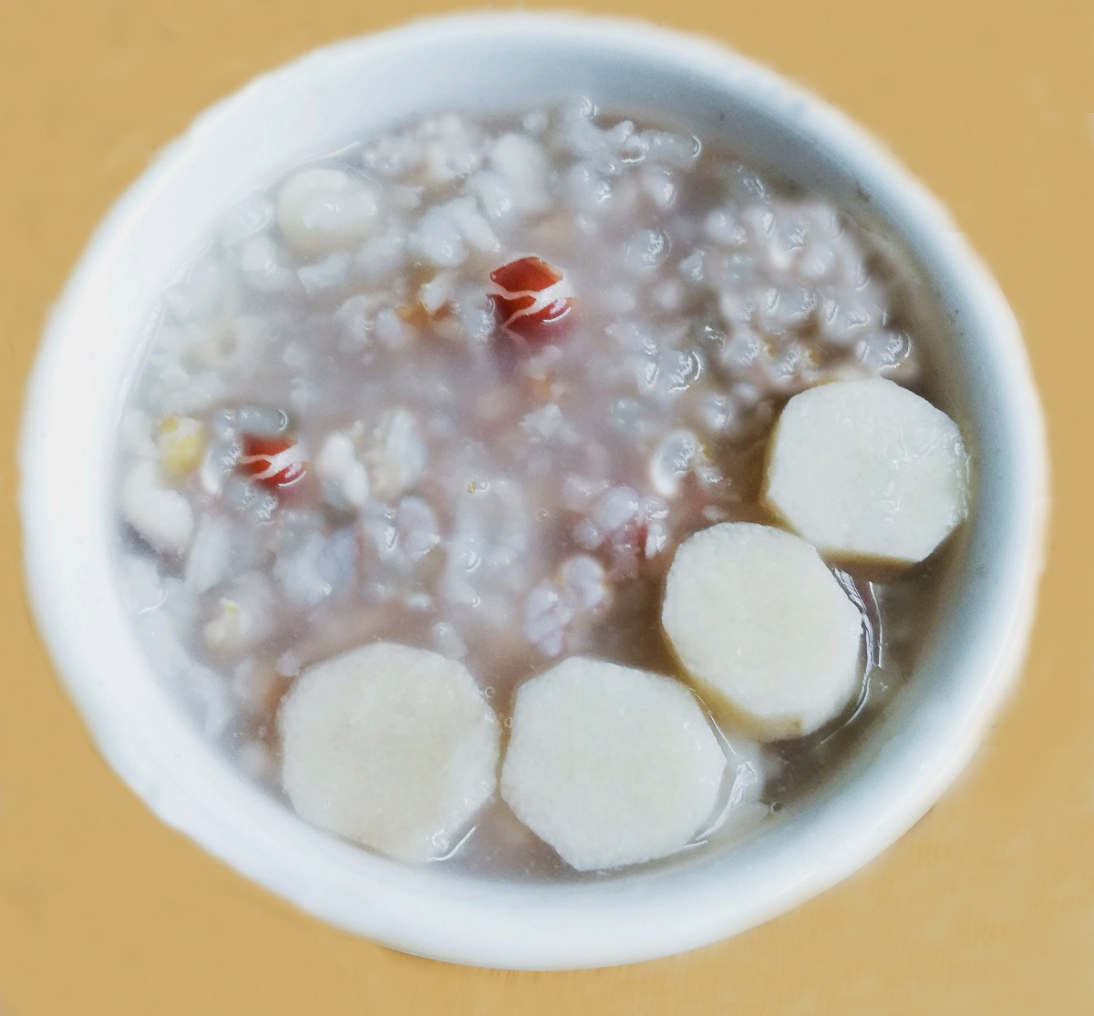 材料:薏米1/4杯,茨实1/4杯,淮山数片,大米2/3杯。
