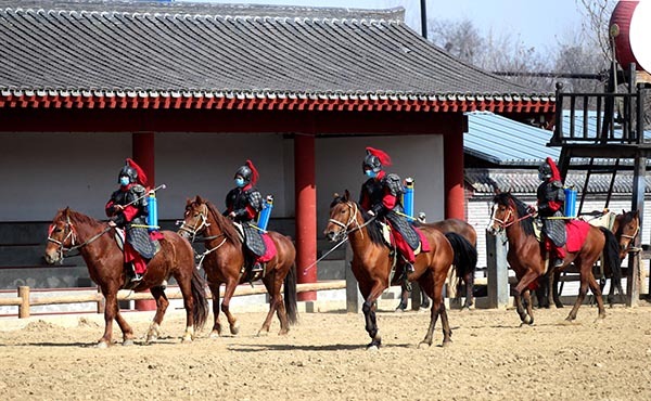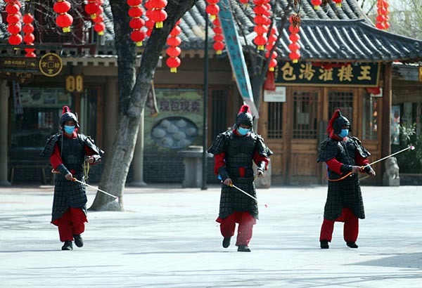 3月10日,河南开封清明上河园骑士们带着口罩背着喷雾器在执行消杀工作。这些在平时演出马战的“宋兵宋将”们策马充实进了防疫消杀队伍,在偌大的园区执行起消杀任务,大家一起全力以赴迎接将于近日的恢复开园。他们在演出时扮演着马背上厮杀的勇士,在疫情到来之时,结合自己的特长,变身防疫战线上的轻骑兵。