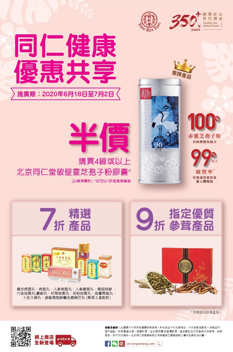 北京同仁堂即日起至7月2日,推出“同仁健康 优惠共享”活动,提供多项优惠予市民,为大众的健康打好基础!活动优惠内容丰富,当中特别提供多款适合男士的保健产品,包括北京同仁堂王牌产品:北京同仁堂破壁灵芝孢子粉胶囊(购买4罐或以上,可享半价优惠),指定产品:健步虎潜丸、人参鹿茸丸、威猛海狗胶囊、鹿尾巴丸等,购买单项2件可专享7折优惠。另外,指定优质参茸产品可获9折优惠。更多详情可登陆:https://cm.tongrentang.com/