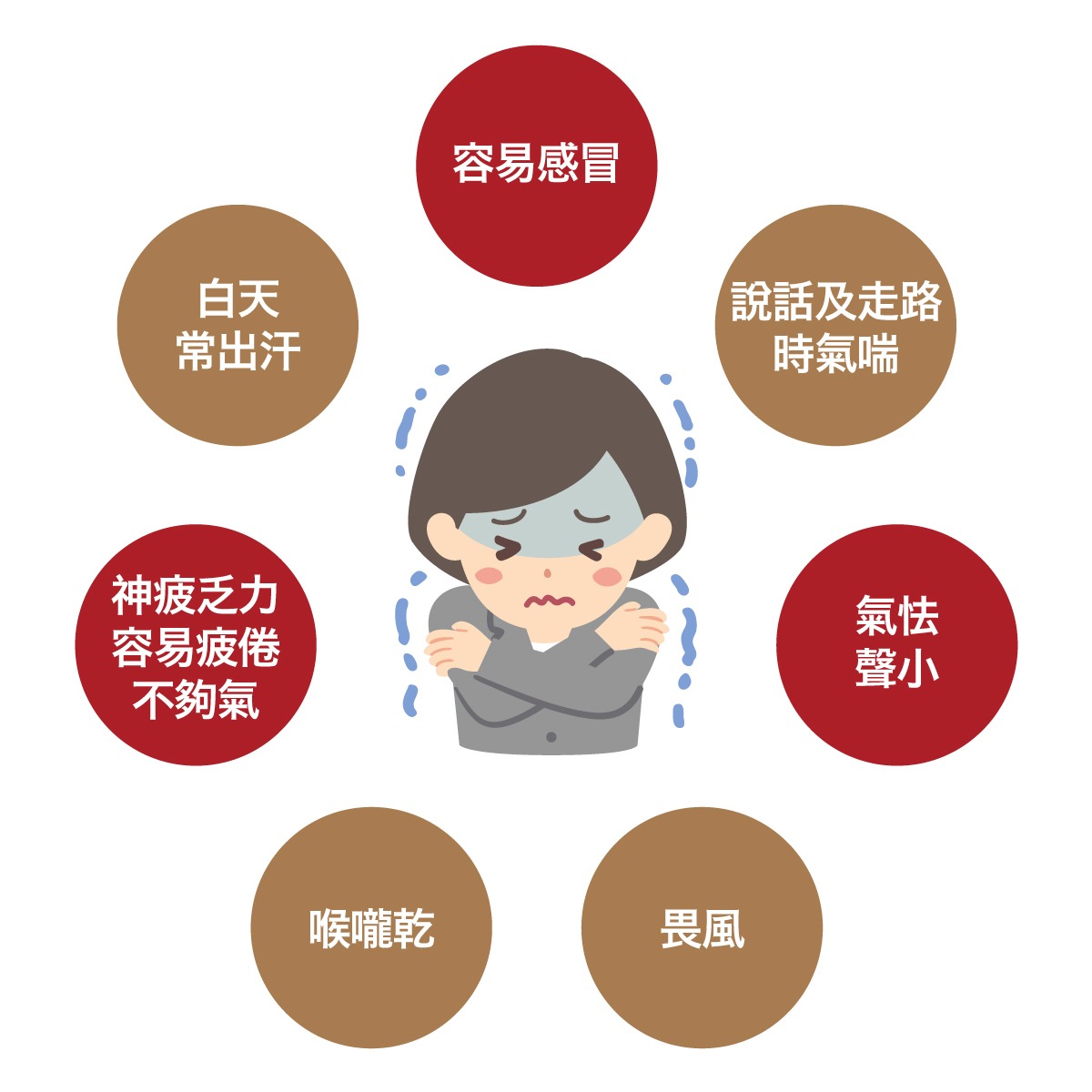 肺虚即肺气虚,常带感冒出现,原因是“表虚不固”。肺主皮毛,肺气足时,可温养皮肤,帮助开合毛窍、调节寒温、抵御外邪;否则易受寒邪入侵,引致感冒。如你常患感冒,要多加注意肺部调理。此外,体力劳动过度者,没有适当休息或调理,亦会耗损肺气。想了解自己是否肺气虚?可留意身体有否出现以下表征,若经常出现其中的症状,是时候加强日常润肺工夫,或向注册中医师寻求协助。