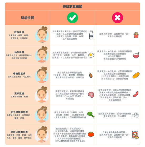 为达到更理想的抗氧化成效,我们会因应个人肤质的需要,来挑选相宜的护肤品;营养师表示日常选择食材时,亦应当如此,食得营养均衡之余,也要留意自己的肌肤特性,配搭适合的食物,然后按肌肤状态调整饮食,以加强护肤效果。