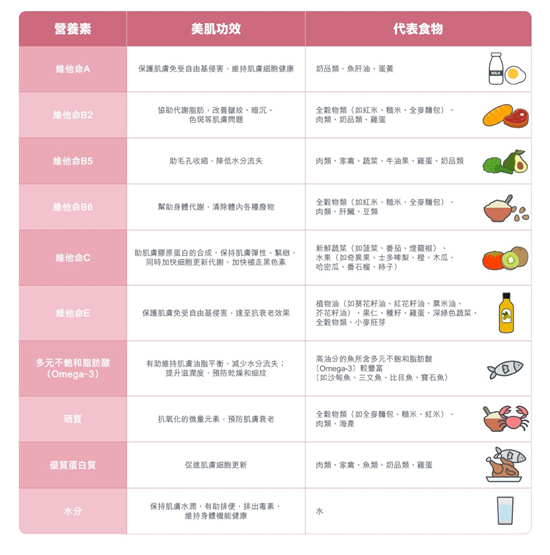 爱美是女士的天性,可是随着年龄的增长,我们肌肤胶原蛋白的自我制造能力会逐渐下降,令肌肤松弛、毛孔粗大、皱纹等问题一一浮现。事实上,要肌肤保持最佳状态,除了做足护肤程序,亦要饮食有道,内外兼顾才可加强护肤成果。原来不同肤质都有不同的饮食法门,现在带你了解多种有助维持肌肤健康的营养素,教你认清肤质,对抗肌肤衰老,留住青春美肌!