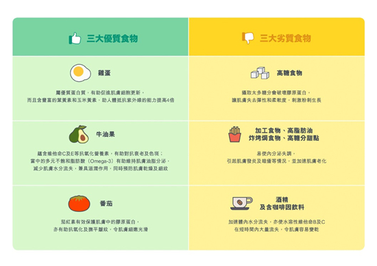 除了自由基,原来女生最爱的甜食和饮品,不少也是破坏肌肤健康的元凶,如蛋糕、珍珠奶茶、法式甜点“马卡龙”等,加快血糖上升速度,令皮脂腺大量分泌油脂,衍生油光、毛孔粗大、暗疮等问题;而辛辣及油炸食物容易累积体内形成毒素,引起发炎,有损肌肤质素,甚至令暗疮情况恶化。以下“三优三劣”食物,让你更易掌握饮食美肌之道!