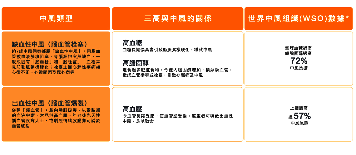 三高是中风的元凶之一,值得留意,近年中风有年轻化趋势,据世界中风组织(World Stroke Organisation – WSO)提供的2016年全球统计数据,每年中风个案中年龄低于44岁的患者占总计的8%。这与都市人的饮食习惯有着密切关系,“高糖、高钠、高脂”的不良饮食习惯,而且缺乏运动,形成三高的健康问题,加上生活忙碌紧张,身心压力急升,焦虑与恐惧等等负面情绪都会引致心跳加速、肌肉紧张,从而影响心血管健康,提升中风的风险。要对抗中风,必须知己知彼,认清中风与三高的关系,降低患病机会。