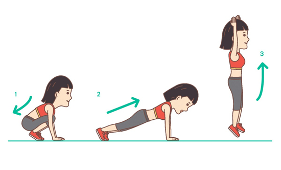3.双脚向前跳,保持蹲下姿势,再以大腿肌肉使身体向上跳。