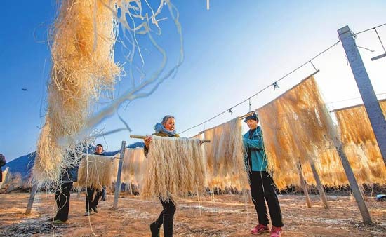 1月5日,在卢氏县范里镇东寨村,当地群众抢抓晴好天气,晾晒粉条。当地的粉条口感爽滑筋道,深受市场青睐,群众通过粉条加工走上致富之路。聂金锋摄
