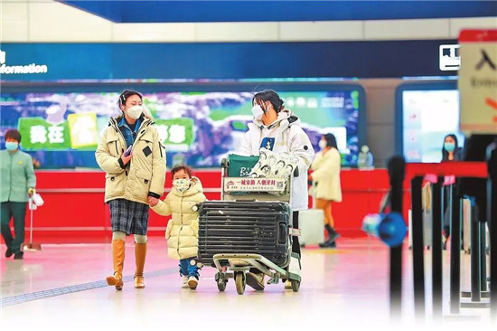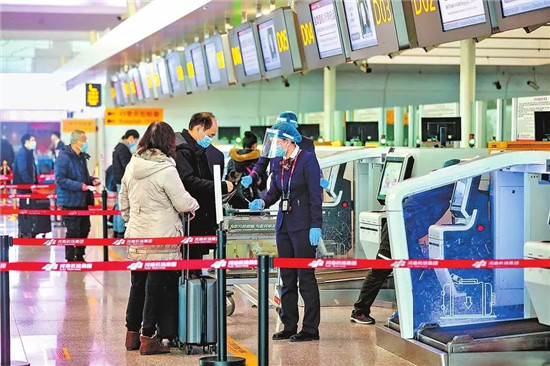 1月28日,在郑州机场,旅客在工作人员的引导下办理值机手续。河南日报记者 聂冬晗 摄