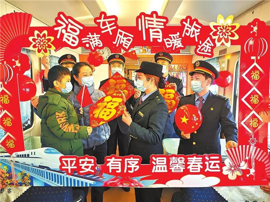 1月28日,在郑州开往温州的K1240次列车上,乘务员把饱含真情的“福”字送给乘客。河南日报记者 王铮 摄