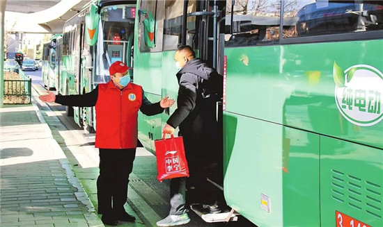 1月28日,郑州公交集团三公司的党员志愿者在郑州火车站西广场开展志愿活动。河南日报记者 聂冬晗 摄