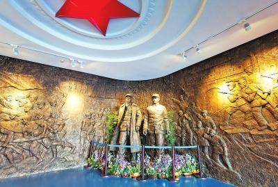 确山竹沟革命纪念馆内,刘少奇和李先念雕塑屹立在序厅,背后的浮雕诉说着竹沟人民英勇抗争的历史。 本报记者 祁道鹏 摄