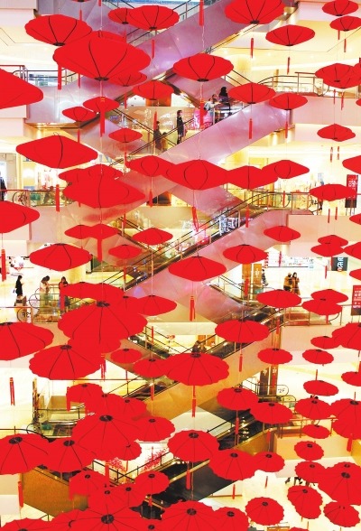 2月2日,郑州某商场挂起灯笼迎接春节的来临。 郭子璇 摄