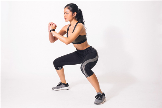 动作:腰背挺直;双手伸前手踭微曲,在胸前位置十指紧扣,胸口正向前方;下蹲时膝盖不超过脚尖;髋、膝及脚尖三点连成一直线,避免外八字脚。下蹲时吸气,向上时呼气,保持自然呼吸,避免闭气。