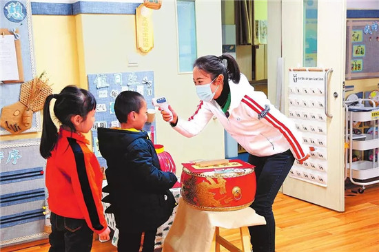 3月1日,郑州市郑东新区普惠路第一幼儿园的孩子们进入教室前进行二次体温测量。河南日报记者 聂冬晗摄