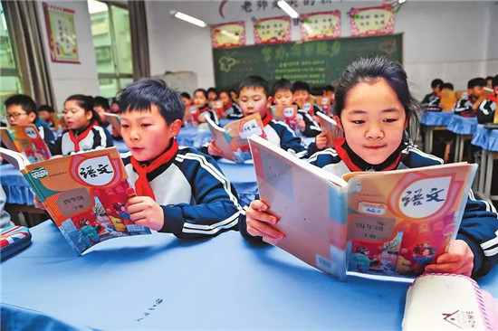 3月1日,焦作市解放区幸福街小学四年级学生正在诵读新课本中的诗词。李良贵摄