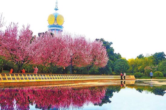 3月15日,游人穿行在柘城县容湖国家湿地公园玉带河畔的桃花园中,欣赏春日美景。 张子斌摄