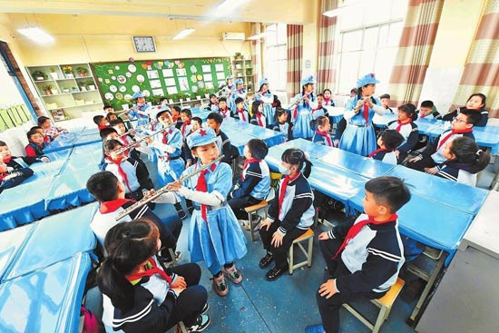 3月17日,在洛阳市西工区唐宫西路小学,学生们正在演奏《十送红军》《游击队之歌》等经典红色乐曲,配合开展思想政治讨论课。潘炳郁摄