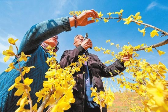 3月24日,在卢氏县文峪乡望家山万亩果药基地,当地群众在连翘地里进行锄草、疏花和施肥等工作。 李东阳摄