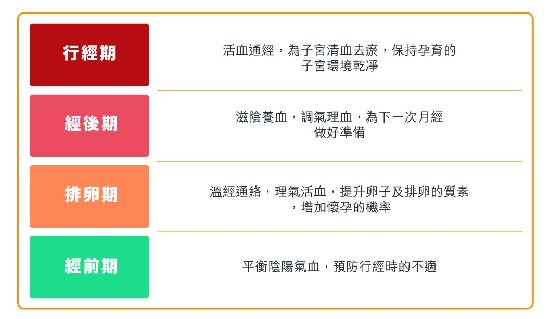 中医说怀孕的先决条件是月经正常,所以中医会按照月经周期4个阶段来调整孕前的保健方向(见下表),以增加怀孕机会。
