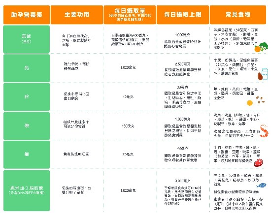 营养师同时提醒预备怀孕的女士除要避免营养不足,亦要小心营养过剩。不少预备怀孕的女士为保持健康而服食营养补充剂,但对其摄取量并不谨慎,若汲取过量可致中毒或影响胎儿,故此必须注意日常的摄取上限。以下是营养师建议的日常助孕营养素及每日摄取上限。