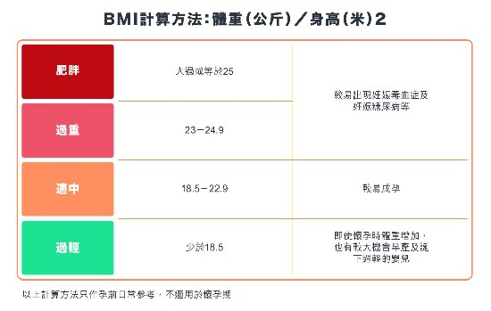 营养学上,体重指标(BMI)过低或过高,会增加早产机会。营养师建议怀孕前最好先维持适中BMI,以助提升受孕机会,同时可预防妊娠并发症。若有需要,可咨询营养师先进行增重或控制饮食,再开始怀孕计划。