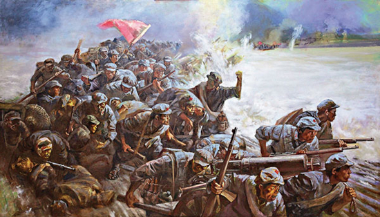 ●日前被中共党史展览馆入选入藏的油画《强渡乌江》,220cmX360cm,作者马骏。
