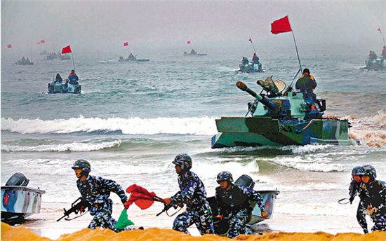 ●“转型”是当下人民海军建设发展的一大关键词。图为早前参加军事演习的海军陆战队官兵抢占滩头阵地。 资料图片