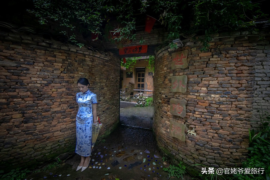 我们是在一场雨后到的三宝村,暮色渐浓,空山云雨后,村子格外的安静。在世外陶源的院门口,我遇到了这位拿着油纸伞穿着旗袍的小姐姐正在拍美照。为了不打扰她更好地表演,一旁静静等待,仔细观察取景环境,再看看这身白色的印有青花的旗袍,我的耳畔一下子响起了《青花瓷》的旋律。