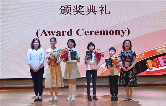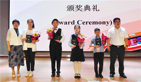 河南省教育厅基础教育处副处长李芳(左一)、中国日报河南记者站站长史宝银(右一)为冠军颁奖 丁友明 摄