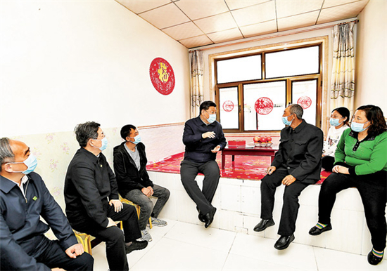 2020年5月11日,习近平在山西省大同市云州区西坪镇坊城新村,同搬迁户白高山一家人坐在炕沿上拉家常。 资料图片