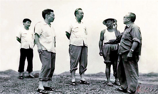 1978年8月,习仲勋(左三)在广东惠阳农村调研。习近平(左一)利用暑假时间参加社会实践活动,随同父亲一起下乡。 网上图片