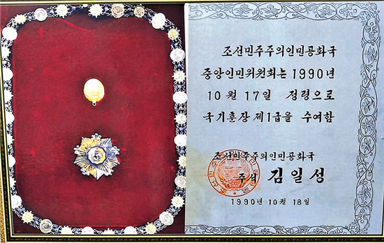 中国人民志愿军战斗英雄李玉安在抗美援朝松骨峰阻击战中“死而复生”,甘在平凡岗位隐功埋名。 香港文汇报记者于海江 翻拍1990年,朝鲜政府授予李玉安“一级国旗勋章”。香港文汇报记者于海江 翻拍