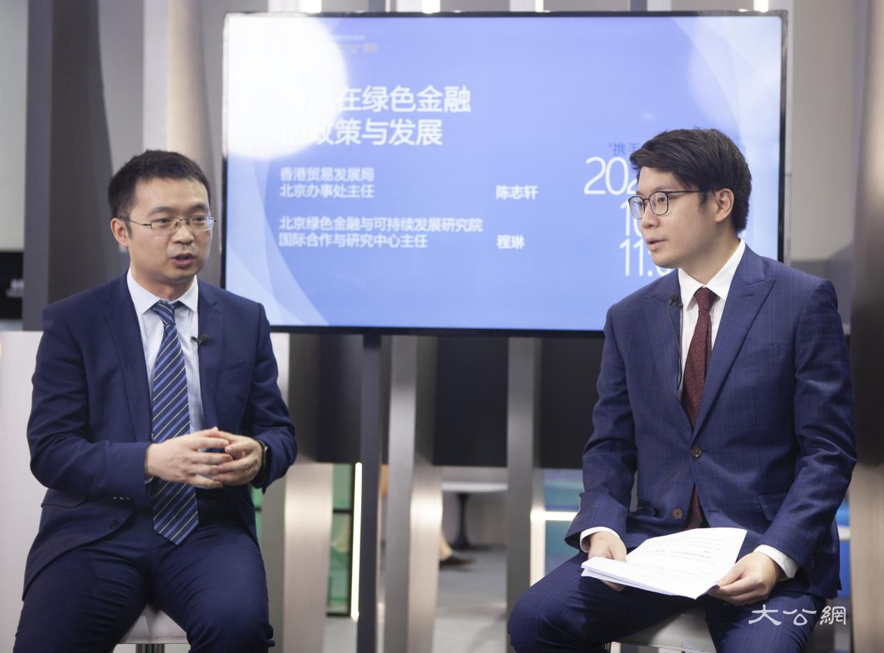 北京绿色金融与可持续发展研究院国际合作与研究中心主任程琳(左)对话香港贸易发展局北京办事处主任陈志轩(右) /记者龚超摄