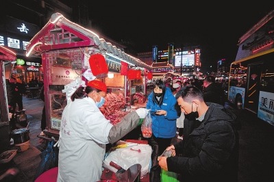 2月23日晚,抑扬顿挫的叫卖声又在开封鼓楼广场、西司夜市和大庆路夜市响起,临时闭市歇业48天的开封夜市再次复市。图为鼓楼广场夜市。
