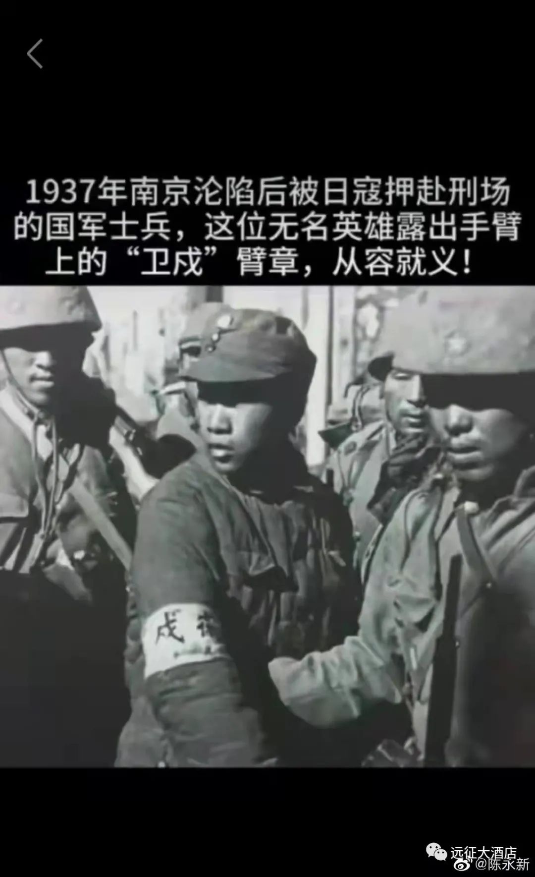 这位年轻的国军南京卫戍部队的士兵,他在回望什么?他是在最后深情回望拼死搏杀仍陷于敌手的南京城吗?他是在向一道被俘并将同时走上断头台的袍泽作最后告别吗?他是在苦苦寻觅已血流成河的南京城中亲人的踪迹吗?