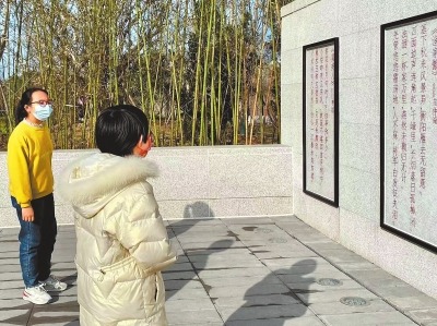 小朋友们在汉字公园内的诗词墙前驻足。赵阿娜 摄