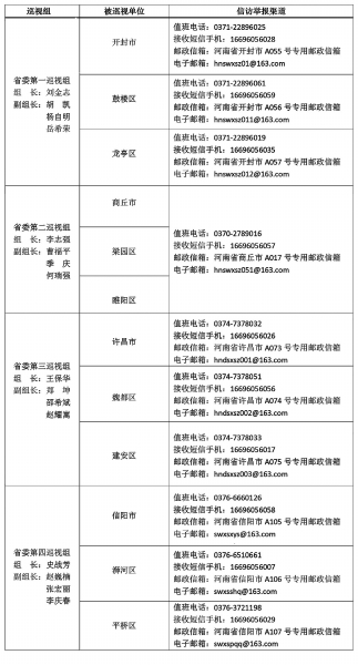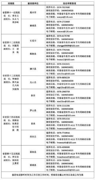 据悉,本轮巡视时间两个月左右,巡视期间设置专门值班电话和专用邮政信箱等,主要受理反映被巡视地区党委领导班子及其成员、下一级党委领导班子主要负责人和重要岗位领导干部问题的来信来电来访。巡视期间,省委巡视组将严格落实中央八项规定及其实施细则精神和省委相关规定,主动接受被巡视地区和社会各界的监督,省纪委监督举报电话12388,省委组织部监督举报电话12380。
