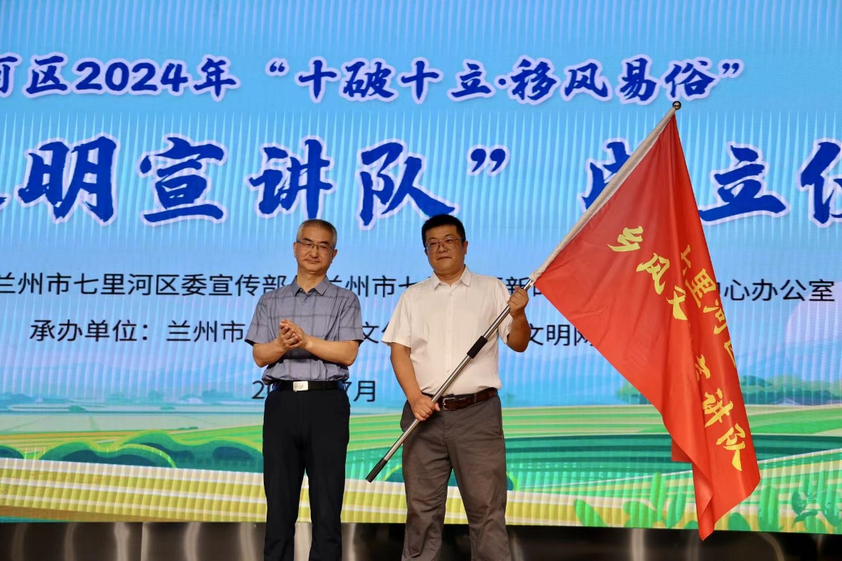 七里河区委常委、区委宣传部部长、区新时代文明实践中心办公室主任查永国向七里河区乡风文明宣讲队授旗(朱奕臣摄)
