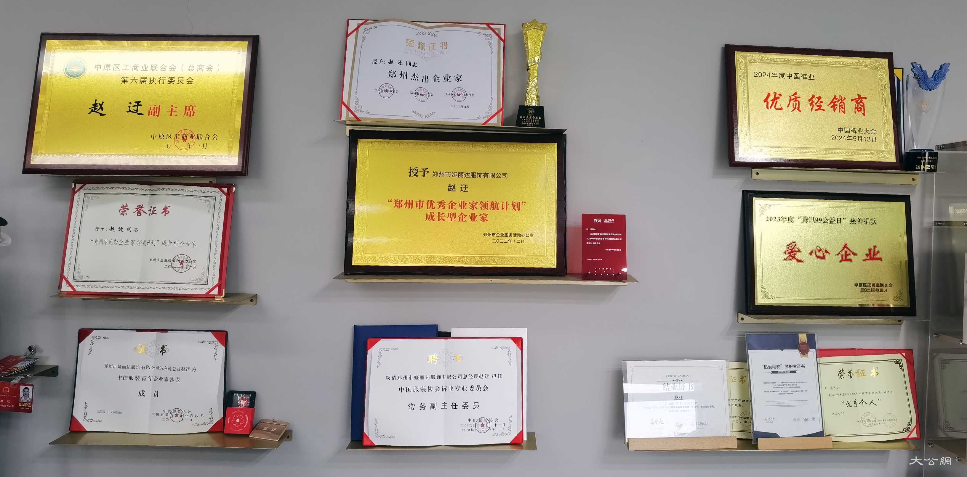 如今,娅丽达已通过ISO9001国际质量体系认证、ISO14000环境管理体系、ISO45001职业安全健康管理体系、两化融合管理体系认证,成功导入卓越绩效管理模式,先后授予“中国驰名商标”“中国服装优质制造商”、国家“企业标准领跑者”“河南省著名商标”“中国服装行业百强企业”等多项荣誉称号,被认定为“国家级新型信息消费示范项目”“河南省省级服务型制造示范企业”“河南省消费品标准化示范项目”“河南省企业技术中心”及“河南省省级工业设计中心”。