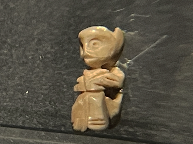 这是一件出土于两岁儿童墓葬中的微雕骨猴——猴脸人身、抱膝蹲坐,高2.2CM,宽0.75-0.95CM,使用动物骨骼雕刻制作,通体抛光,制作精巧,栩栩如生。