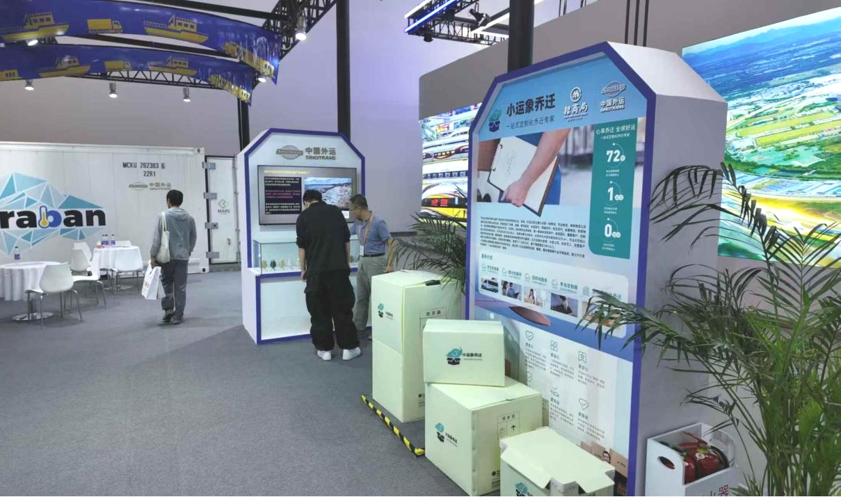 “运万物,连世界”——中国外运旗下“小运象乔迁”服务产品是能够满足全球各种规模需求的乔迁服务,客户服务团队经验丰富,屡获殊荣,已为多国大使馆、大型公司、知名艺人、别墅客户提供过定制化乔迁服务,致力于打造有温度的"一站式定制化乔迁"服务。中国外运能为各行业提供令客户满意的解决方案,以冷链物流为例,展台中所呈现的冷藏集装箱利用非热能空间电场技术,通过电源、控制系统及库内电极的组合在冷藏集装箱内制造特殊的电场环境,使食材在达到通常结冰的冰点以下温度也不会结冻,实现保鲜冷藏。还可以通过电的化学还原作用防止食材氧化,并利用臭氧和环境调节有效抑制微生物(细菌)的繁殖,使保鲜效果较之常规的冷藏集装箱提高5倍以上。