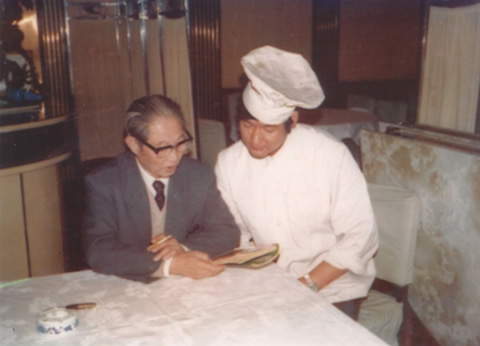 1985年,大董与团结湖烤鸭店经理林雅萱老先生讨论(《全聚德史话》里面的菜品)